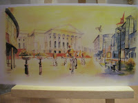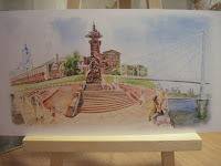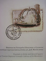 Открытка № 4. Фонтан у ЦУМА. Если придерживаться географии, то слева от фонтана находится как раз ЦУМ, но автор изобразил здесь Областную научную библиотеку, которая находится на соседней улице. Напротив библиотеки виднеется старая водонапорная башня. Скульптурная девушка из ложек действительно существует (я ее даже фоткала, но найти пока не могу), но стоит через дорогу от фонтана.